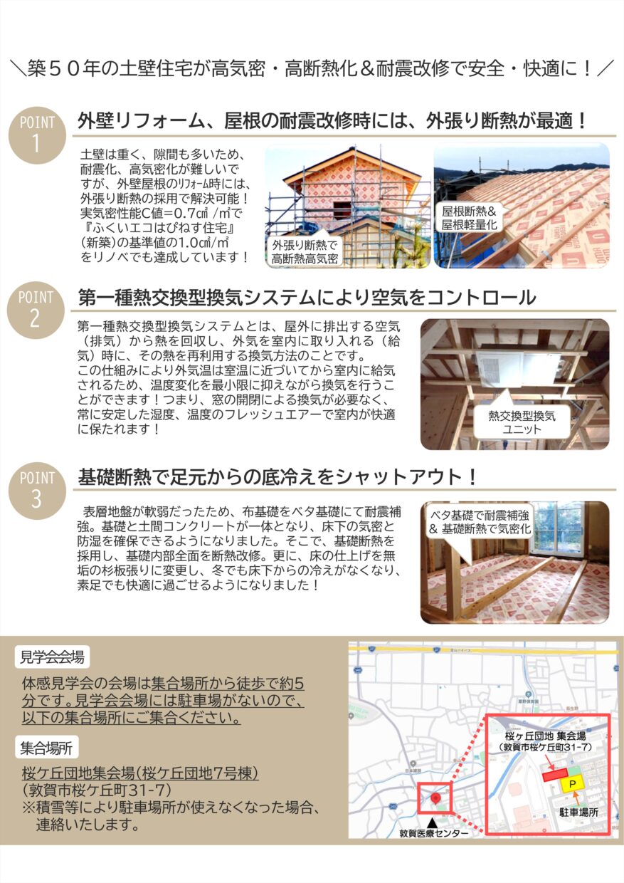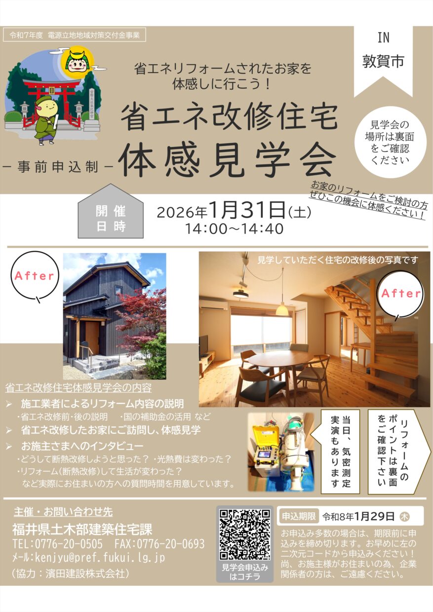 2026年1月31日(月)に福井県土木部建築住宅課さん主催で、敦賀市野坂の弊社のクライアント様宅にて、省エネ改修住宅体感見学会が開催されます。詳細は、以下をご確認ください。今回は、築50年の木造在来軸組構法の2階建てのフルリノベーション物件の見学になります。断熱改修、耐震改修の物件で、断熱改修の仕様は、UA値0.33 ηA値1.4 BEI 0.62(一次エネ消費量削減率 38%) 完成時気密測定値C値0.7㎝2/m2、断熱等級6のエコはぴねす住宅の仕様を大幅に上回る、高気密超高断熱リノベ仕様となっています。今回、5組限定の少人数での開催となっておりますので、お申し込みは、お早めに、福井県さんの方に直接お願いいたします。Webからの申し込みは、福井県さんのフォームからお願いいたします。 https://x.gd/cL3Va 以上、宜しくお願い申し上げます。